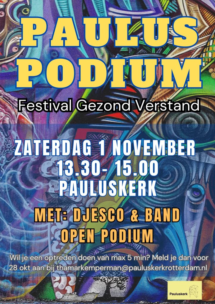 Kom ook naar dit speciale Paulus Podium! Djesco & band komen spelen én er is een Open Podium. Mensen die weten hoe uitdagend het soms kan zijn om je gezond te blijven delen op dit podium hun verhalen in allerlei kunstvormen. Wil je ook een optreden doen van max 5 minuten?