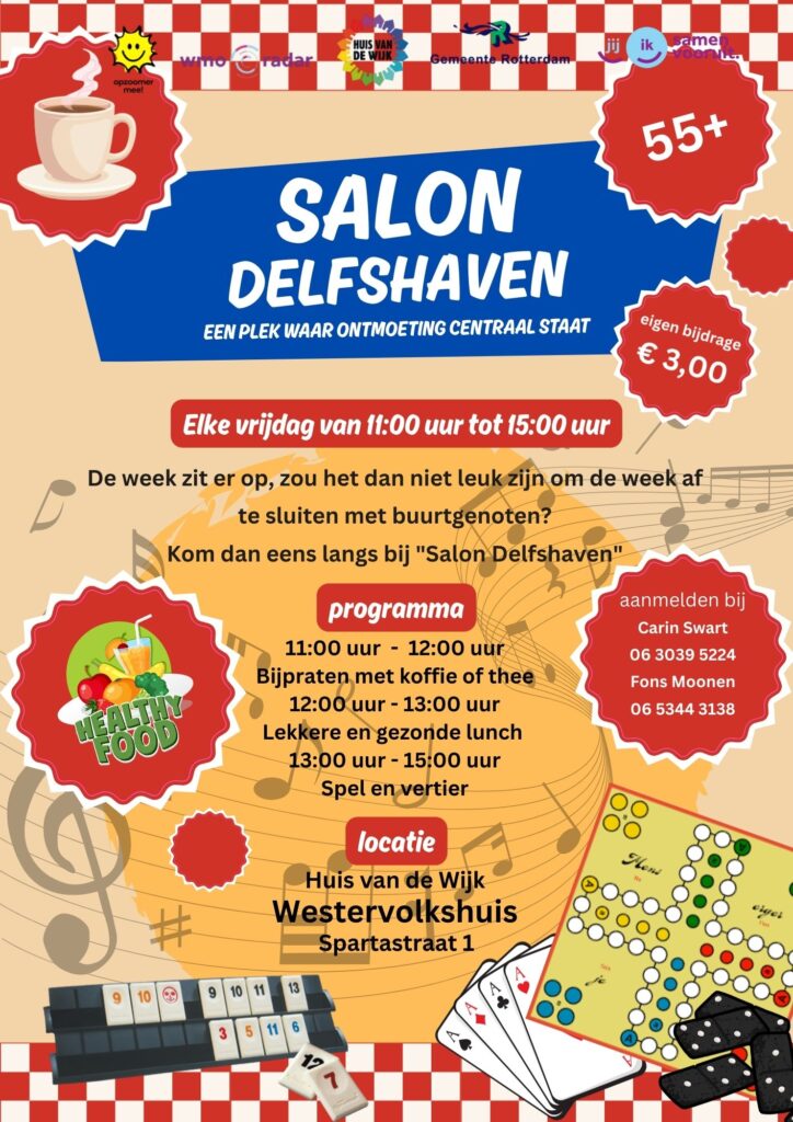 Salon Delfshaven, een plek waar ontmoeting centraal staat. De week zit er op, zou het da niet leuk zijn om de week af te sluiten met buurtgenoten? Kom dan eens langs bij Salon Delfshaven. Met bijpraten met koffie en thee van 11:00-12:00, een lekkere en gezonde lunch van 12:00-13:00 en spel en vertier van 13:00-15:00., (55+/eigen bijdrage € 3,00)