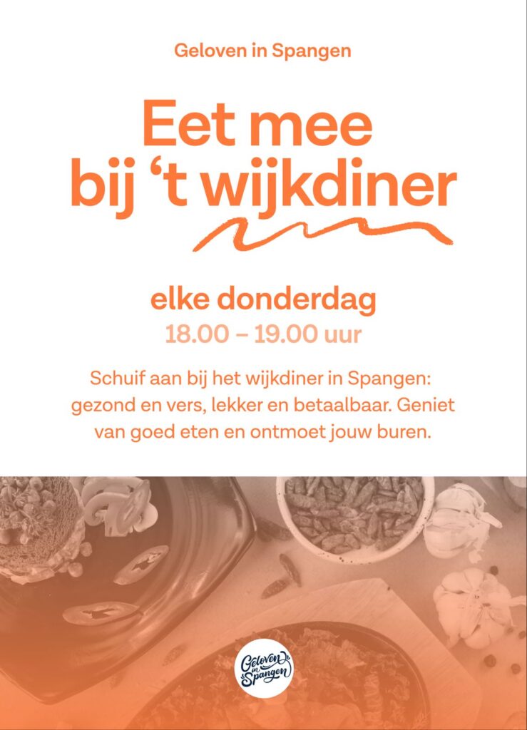 Schuif aan bij het wijkdiner in Spangen: gezond en vers, lekker en betaalbaar. Geniet van goed eten en ontmoet jouw buren. Voor gezinnen en bewoners in de wijk Spangen is er elke donderdag van 18.00 – 19.00 uur een gezellig wijkdiner (halal) in Tussen Hemel & Aarde. Ook is er elke week een ‘mystery guest’ die iets vertelt waar je als wijkbewoner wat aan hebt.